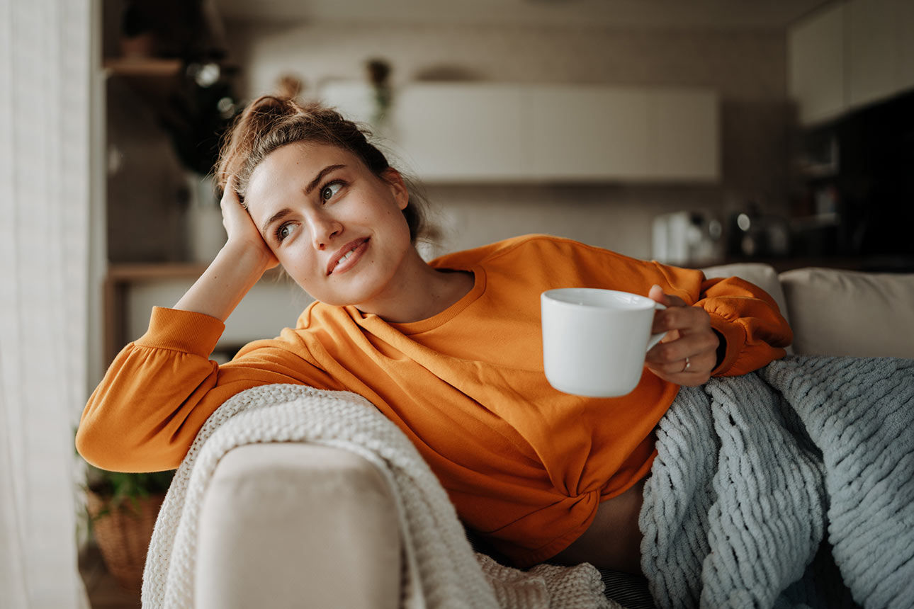 Frau mit Kaffeetasse arbeitet an einem Tablet